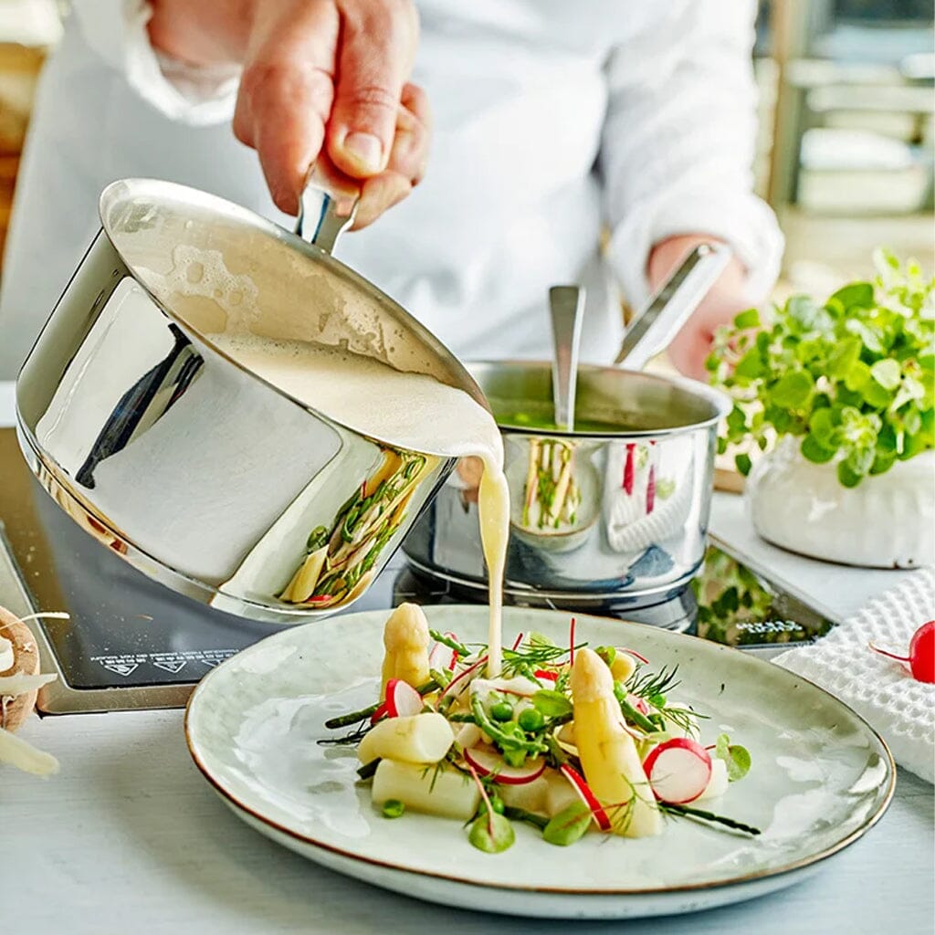 Cette casserole magnifiquement polie est fabriquée en acier inoxydable de haute qualité et possède un fond à 3 couches de 3,5 mm d'épaisseur, qui assure une excellente répartition de la chaleur. Convient à tous les feux, y compris l'induction, et passe au four - idéal pour cuisiner et garder votre sauce au chaud. Grâce au bord verseur pratique, vous pouvez verser la sauce directement sur votre plat sans en renverser. Cette petite poêle offre de grands avantages et constitue un ajout élégant et fonctionnel à toute cuisine.