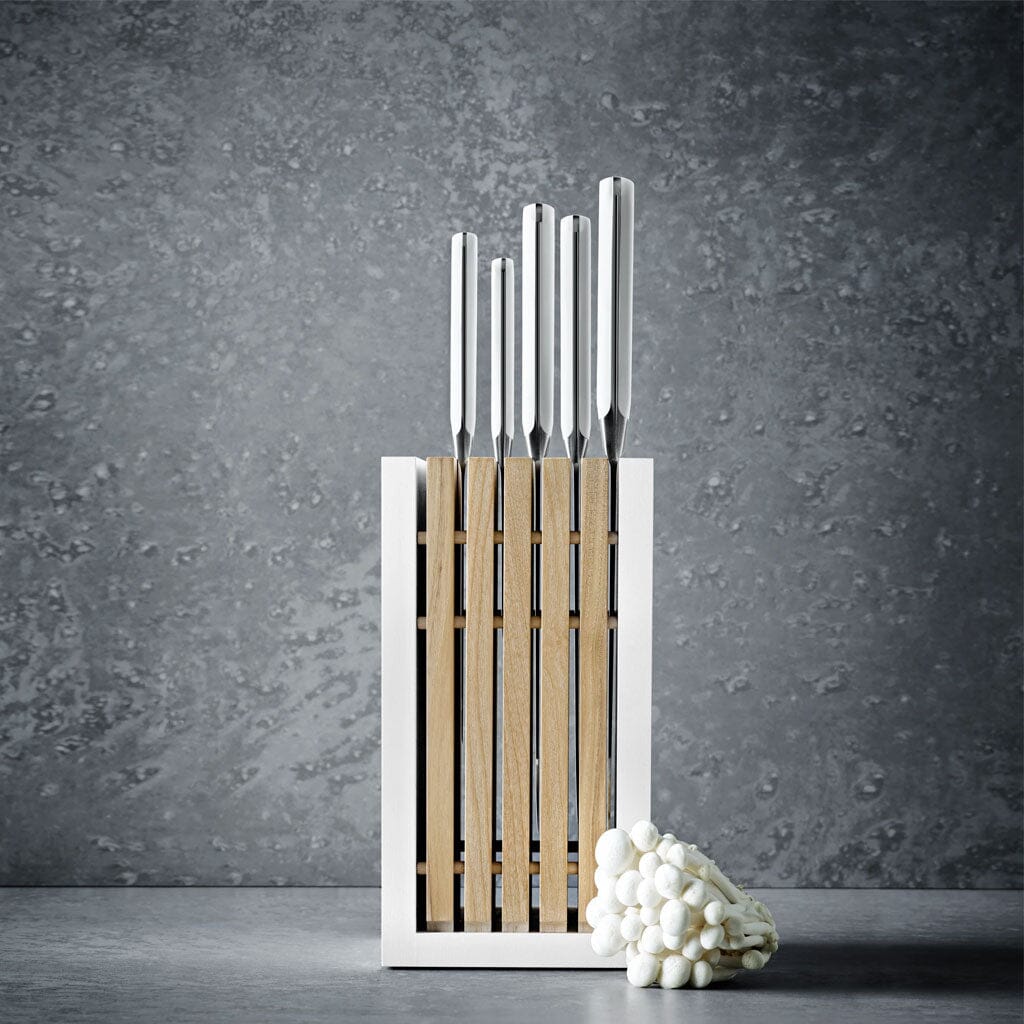 Le bloc à couteaux en bois inclus garde vos couteaux en sécurité, bien rangés et toujours à portée de main – un ajout élégant et pratique à tout plan de travail de cuisine.