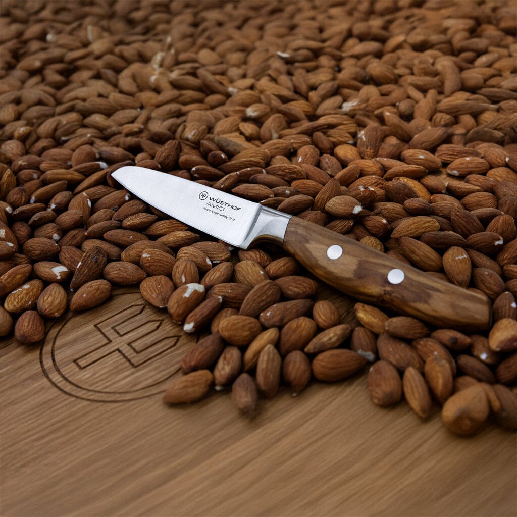 Cette édition de la série Amici se démarque par ses rivets en acier inoxydable et sa finition sans couture. Le couteau est conçu comme un outil robuste capable de relever tous les défis, avec un demi-mitre qui réduit le poids pour un meilleur contrôle et un affûtage plus facile de l'ensemble de la lame.