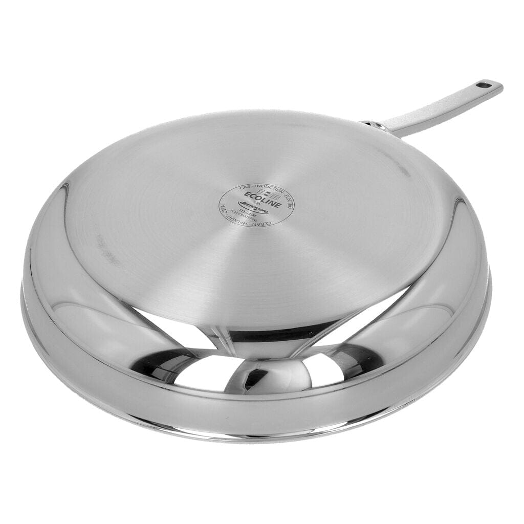 The handsome stainless steel Ecoline 5 frying pan 32 cm from Demeyere is a joy to work with and delivers beautiful results. It fits comfortably in your hand and is constructed from 5-layer material, right up to the rim. This solid combination of alloys distributes heat effectively, allowing you to fry evenly and with control, even on a low setting.