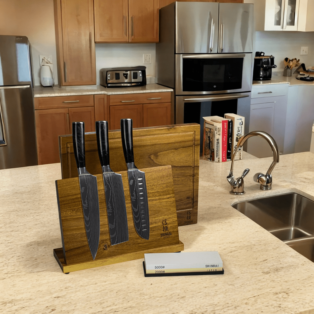 A wonderful combi deal that provides you with all the necessities in the kitchen in one fell swoop. Enjoy a 3-piece knife set of German quality with a beautiful knife holder, sharpening stone and cutting board. The Japanese Onyx Print Series knife set from Shinrai Japan is unique for every kitchen. This unique combination deal with a knife set, luxury sharpening stone, magnetic holder and cutting board will come into its own in your kitchen.