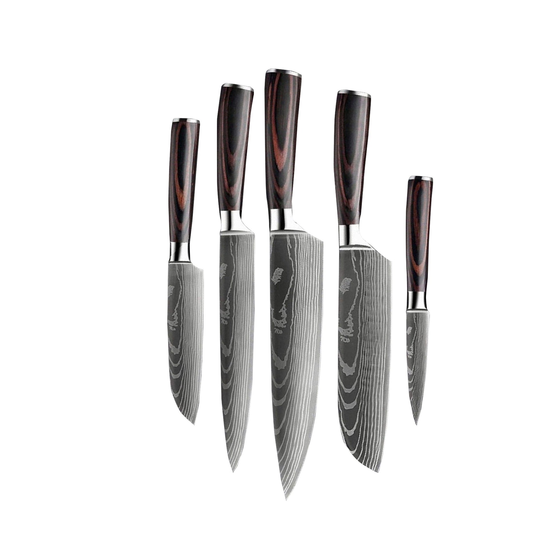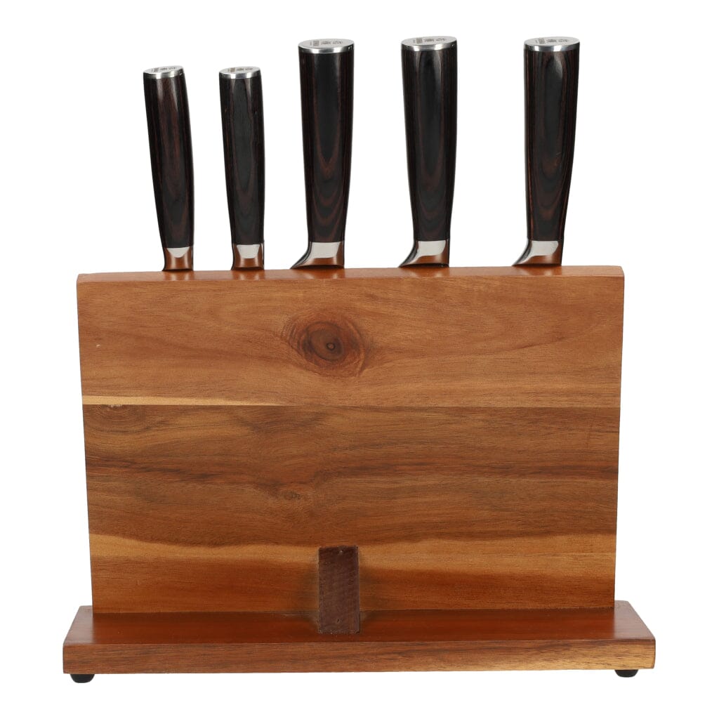 Shinrai 's Damask Print Series offers a perfect balance between form and function. Each knife is crafted from high-carbon steel , features a decorative damask pattern, and is finished with pakkawood handles. Combined with the magnetic acacia wood knife block, this compact and practical set completes your kitchen.
